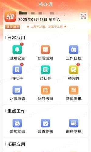 《湘办通最新版》这款软件能够很好的支持部门间文件传输、推送消息,使用起来能够帮助各部门之间更好的进行沟通。而且这款软件还能够帮助下级机关定期填写进度情况,系统自动提醒逾期事项,领导可实时查看监管看板。将工作上的各种公告实时通知用户,用户可随时查看实时通知的工作公告内容。用户可以随时在这里提供财务报销工作,可以在线报销各项财务费用等等工作内容,快来下载湘办通最新版吧!