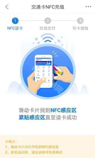 3、进入首页中开启NFC充值新体验,只需将手机靠近交通卡,瞬间完成充值,科技让生活更简单。