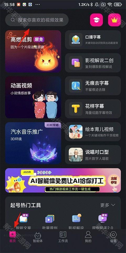 1、打开美册视频制作软件,点击【首页】的搜索栏;