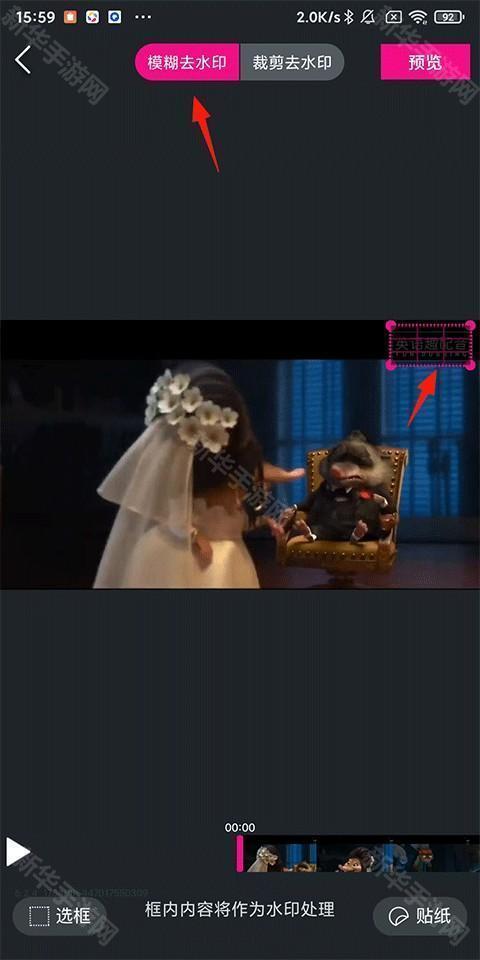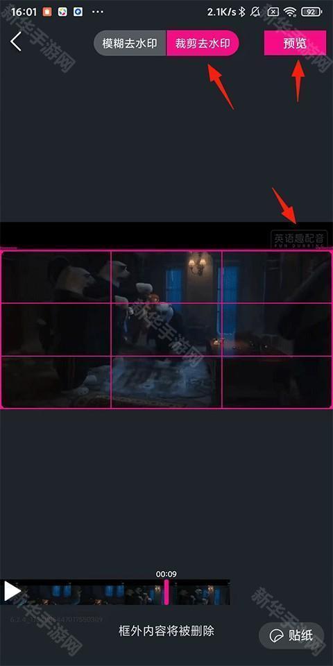 5、【裁剪去水印】框选无水印位置,框外内容将被删除,最后点击【预览】并进行导出。(注:此功能需要开通会员)