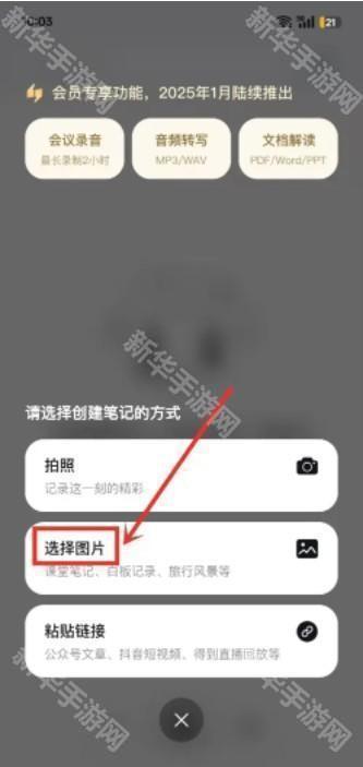 在弹出的选项列表中,选择【选择图片】以从您的手机相册中挑选想要添加到笔记中的图片。