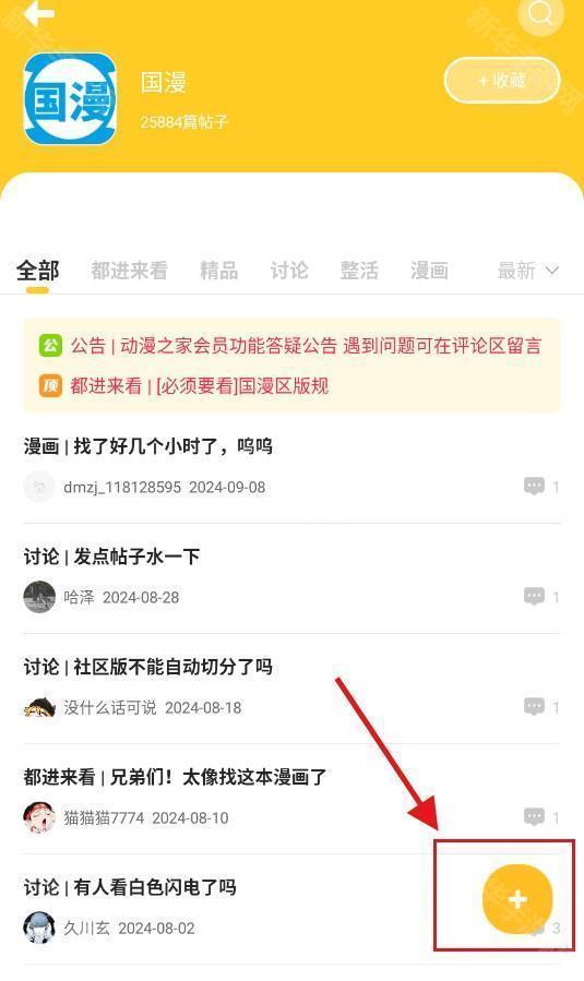 2、加入专题栏目后,点击右下角的+号按钮可以发帖