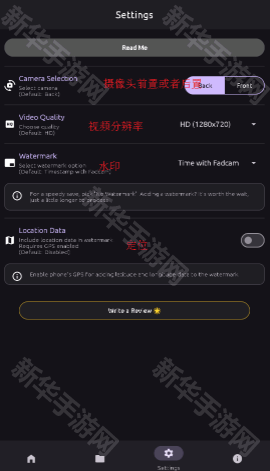 在设置界面,选择前置或后置摄像头,调整视频分辨率、水印和定位等选项,确保拍摄符合个人需求。