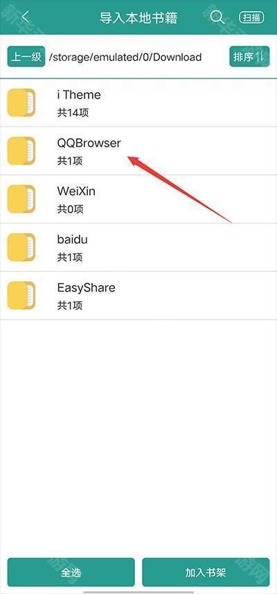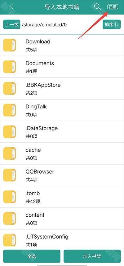 3、接着在手机目录下,找到你需要导入小说的保存文件夹,可直接点击“扫描”查找