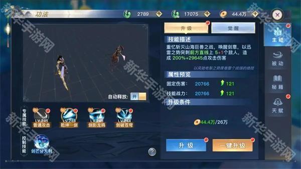技能升级:可使用铜钱对技能进行升级。一键升级功法将按顺序平均升级,当铜钱不足或技能升至当前最高级时自动停止。