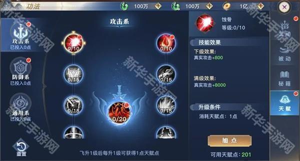 天赋点可对攻击、防御、通用系类型天赋进行加点,越往后的天赋加点有前置条件;