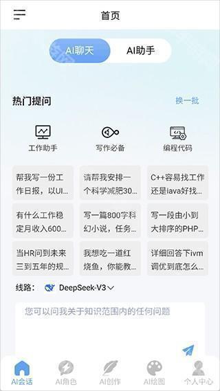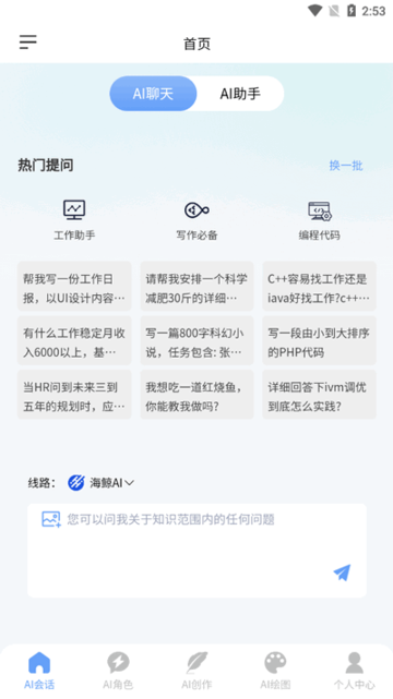 1、打开海鲸AI软件,在AI聊天页面,可以向它问各种问题,点击线路还可以切换聊天模型