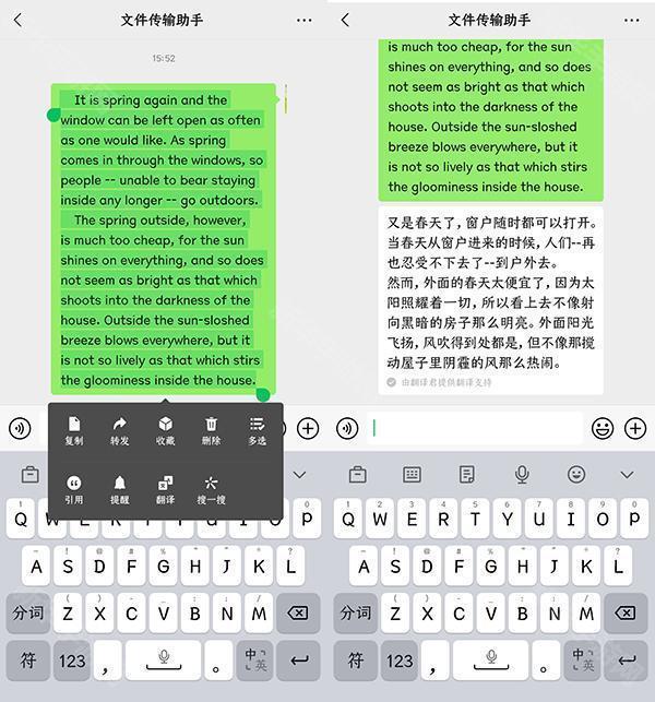 当你和朋友聊天时,如果在输入框中长按,就可以触发这个功能,边写边译。这样我们就可以一边打字一边进行翻译,然后点击使用发送。同时在左上角还可以切换成日文或者韩文等语言。
