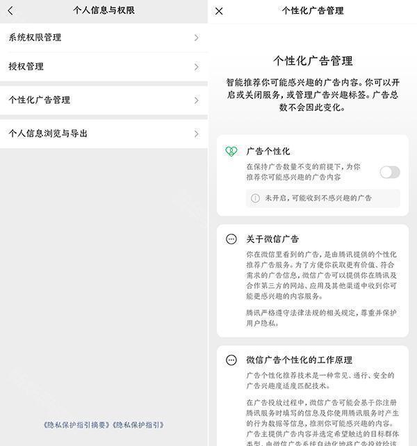 在朋友圈点击广告卡片右上角的「广告」按钮后,弹出的设置界面改版了。除了支持一键关闭当前广告以外,还可以快速进入个性化广告的设置界面,支持关闭广告个性化推荐。但这只是关闭了个性化推荐,并不能永久关闭广告。