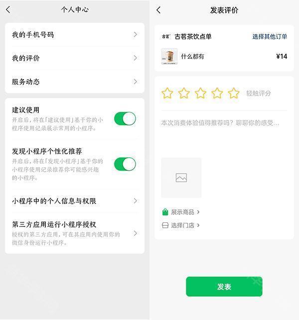 在微信「发现」页打开「小程序」后,在页面点击右上角「人像」按钮,进入个人中心,里面新增了「我的评价」功能,可以查看你评价过的小程序订单,也可以对未评价的历史订单进行评价/打分。