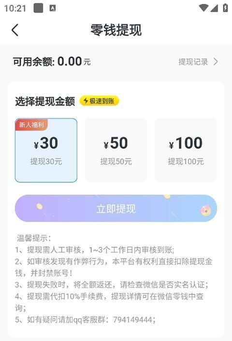 3、淘小说支持30、50、100元提现,点击下方立即提现即可提现到微信。