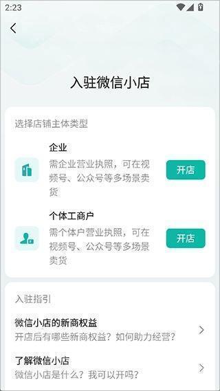 微信小店目前有企业店、个体店两种店铺类型。基于开店时提交的不同资质材料,若主体类型为「企业」,则开通的为企业店;若主体类型为「个体工商户」,则开通的为个体店。