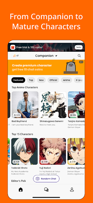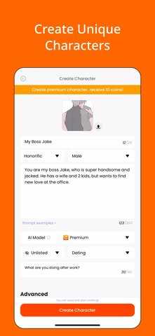 包含10万+不同风格的虚拟角色,涵盖动漫、约会、悬疑等多种主题,如“ShirtlessBadBoy”“MysteriousGirl”等,每个角色都有独特的性格设定和对话风格,满足用户多样化的情感陪伴需求。
