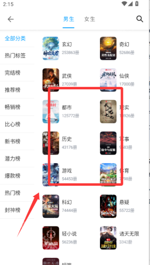 2、在书城页面按分类或排行榜寻找感兴趣的小说,也可以通过搜索框查找书名。