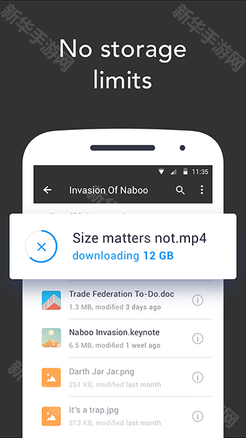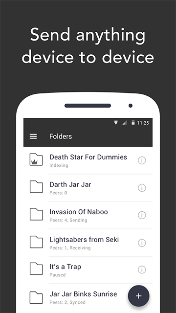 《Resilio Sync安卓版》这是一款非好用的手机文件传输软件,使用这款Resilio Sync安卓版能够让用户在平板电脑、苹果设备之间进行快速的文件传道,使用非常的方便,就算是大文件也可以快速完成。更重要的是,在同步过程中,Resilio Sync安卓版自动加密所有文件,以保护数据隐私,用户能够直接发送照片、视频、电影或其他大文件,也不用担心文件泄露,非常安全,快来下载Resilio Sync安卓版试试吧!