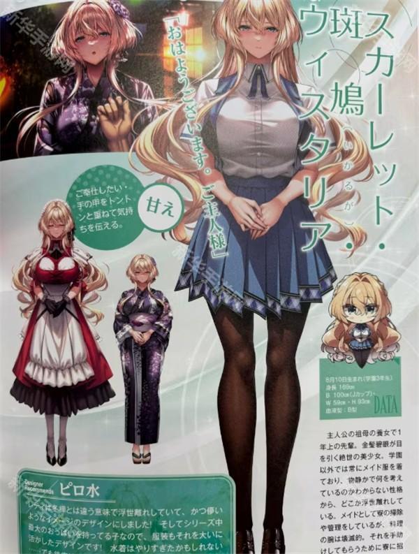 水老师的创作思路:斯卡蕾特是以与冬桦不一样的、不问世事的(由于不知道「レティ」这个词的具体意思,因此我只能按照我自己的理解来翻译,MD,这个「レティ」到底是什么意思啊!)、虚幻的为印象设计出来的角色,请好好期待哦……!这样的女孩来做女仆什么的最棒了!!