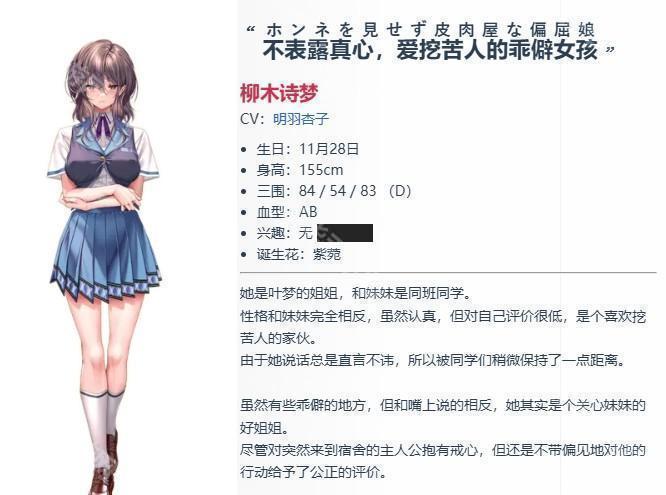 介绍:同级生,同时是叶梦的姐姐。与妹妹的性格相反,不知为何对自己的评价很低的讽刺家。因对人严厉、口不饶人,所以同班同学都有些与她保持距离的意思。虽然有这样那样奇怪的地方,但与严厉的话相反,是个关系妹妹的善良姐姐。虽然对突然来到宿舍的主人公抱有警戒,但也会不带有色眼镜地评价他做的事。
