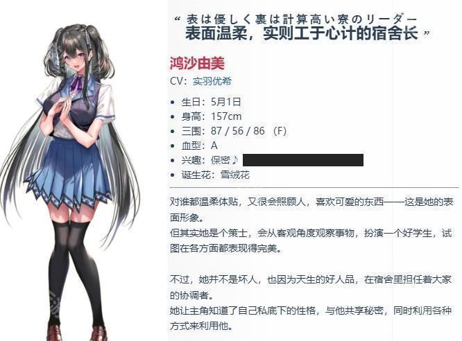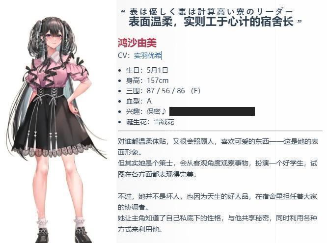 介绍:对谁都很温柔很会照顾人的同级生。非常喜欢可爱的东西的女孩!在这样的表面背后,却是一个深谋远虑,总是以最优策略行事,扮演者优等生的谋士。但天性中的善良还未消失,在宿舍里自然的成为了众人的主心骨。被主人公知道了“里人格”后,一边与其分享秘密,一边这样那样地利用他。
