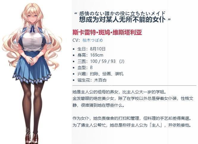 第四位女主斯卡雷特 ·斑鸠 ·维斯塔利亚,她自称是女仆,管男主叫主人sama,这谁不喜欢啊。