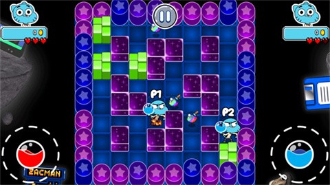 2、进入关卡后玩家滑动左边屏幕可以控制角色移动,角色只会沿着直线前进,右下方是放置水炸弹按钮。