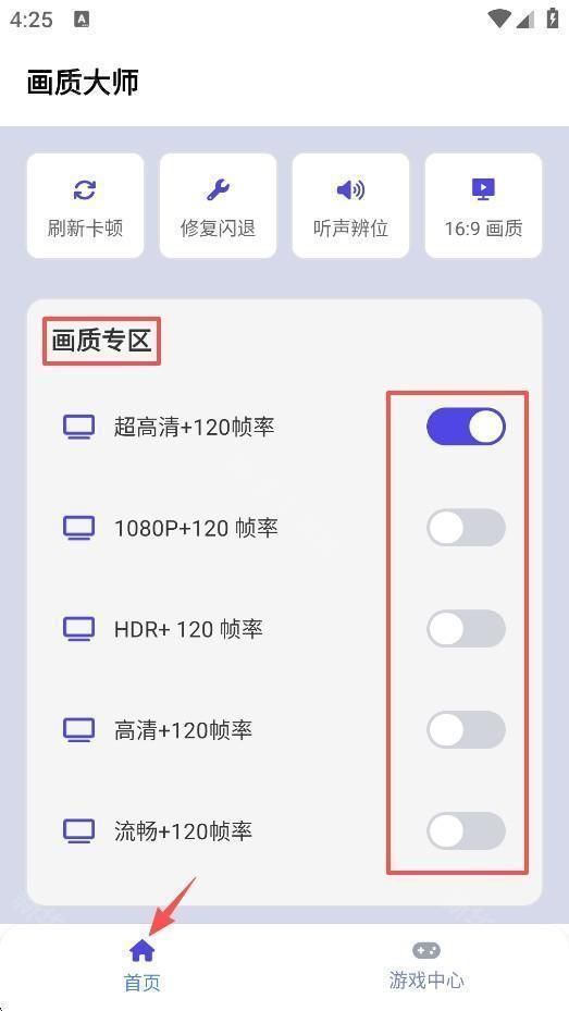 打开画质大师,开启首页-画质专区-【超高清+120帧率】右侧的开关按钮即可。