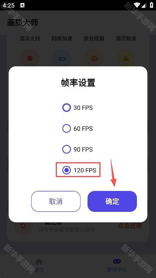 2、在打开的帧率设置页勾选【120FPS】,点击【确定】即可。