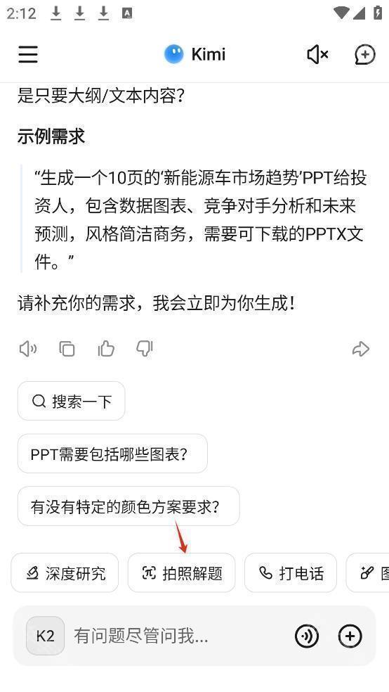 1、打开Kimi智能助手应用,登录后在主界面找到拍照解题功能。
