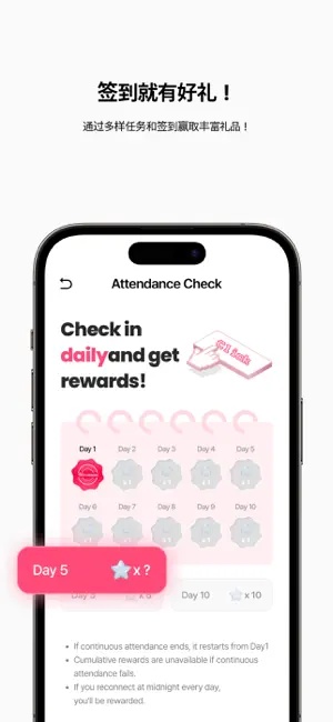 明星阵容2.0(签到与任务):这是一个激励粉丝参与的功能。用户通过每日签到和完成任务,可以获得各种礼物和奖励,增加应援的积极性。