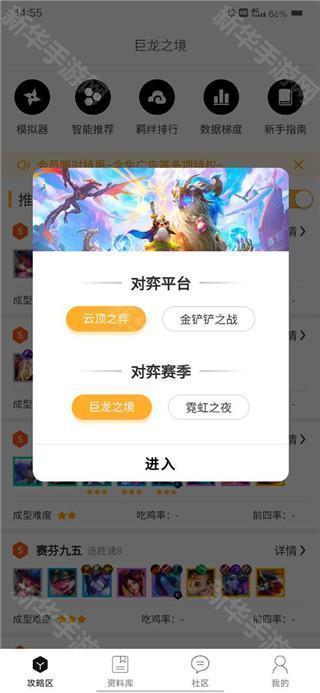 云顶攻略助手用户轻松就能通过此软件实时查看到最新的角色阵容搭配攻略,以及各种非常详细的游戏操作指南,协助自己能够掌握到更多不一样的全新技巧。最主要的是软件里还建立有专属的社区通道,随时都可以在线和成千上万来自全国各地的大神玩家在线分享游戏心得,从中学习都各路大神的优点。