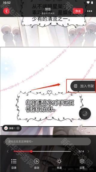 6、点击漫画中间可以出现自动播放,亮度调节等,点击中间的“加入书架”