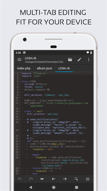 1.支持物理键盘,包括组合键、3个应用程序主题和30多个语法突出显示主题供你使用。