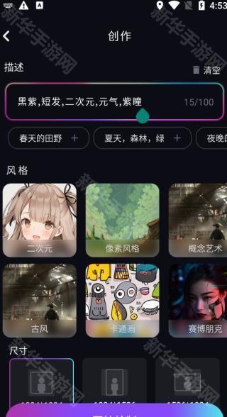 意间AI绘画是一款有着丰富的工具的ai绘画工具软件,有了这款软件只有哪怕你是新手画家也可以自由地创作出自己满意的画面,自由的完成创作,将所有不同的场景都在你手下创作出来。在这款软件内有着丰富的绘画工具,你可以自由的选择各种不同的关键词,根据你需要的不同的画面来输入各种不同的关键词,这样软件就能为你生成出不同的精美画面,感兴趣的用户们就来本站下载吧。