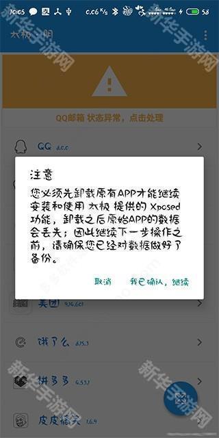 这是因为以前的Xposed 模块都是为Xposed设计的;这个在 太极中,并不适用。一般情况下,不用理会这种提示(比如音量放大);但是,如果Xposed 模块检测未激活之后不让你使用(比如:QQ净化),那么你可以先把 Xposed 也渡劫一遍。