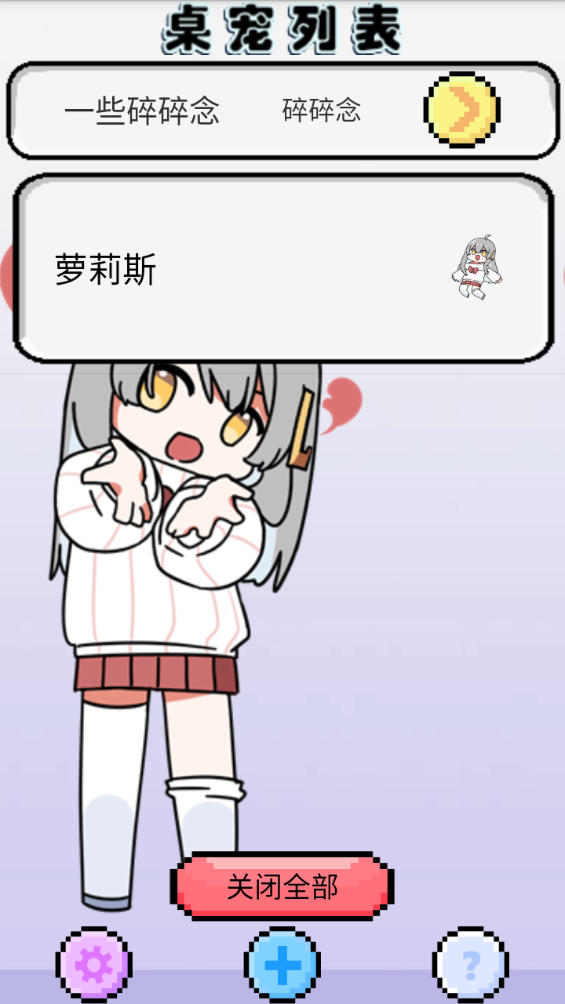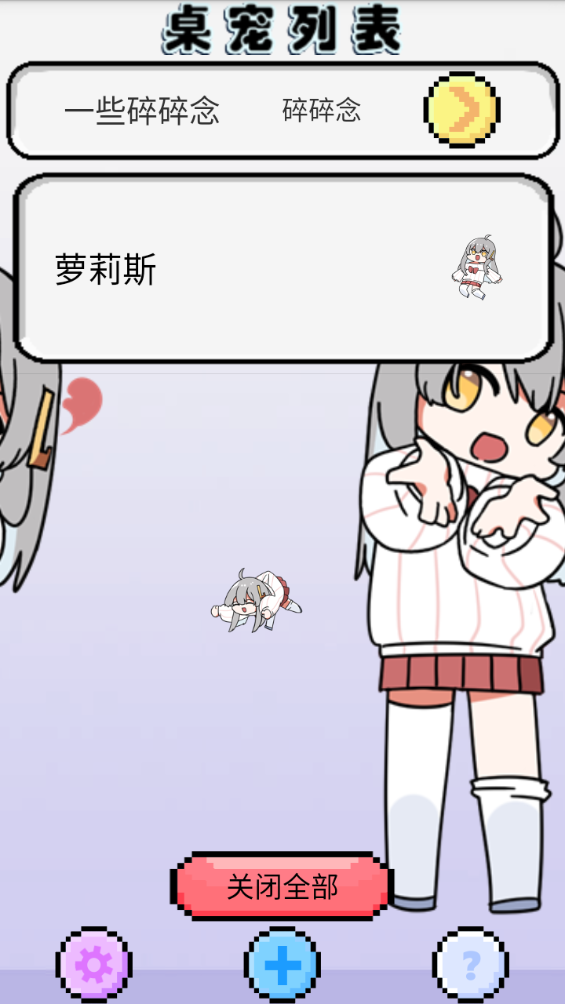 这款软件能够让用户可以在手机上饲养一直可爱的桌宠,这个桌宠叫做“萝莉斯”,你可以和她互动,而且她也会对你的动作得到反应,也可以让她自由活动或者帮她洗澡喂食等等。
