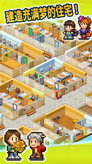 《幸福公寓物语中文版》这是一款模拟经营类型的游戏,游戏由“Kairosoft”工作室出品,这个版本已经经过汉化,玩家将成为一个公寓住宅的房东,你将见到各种形形色色的房客,看着他们工作、生活,甚至是结婚生子,各种道具也可以用来改变居民的属性、职业和兴趣,帮助他们掌握自己的生活,在各个领域取得成功,吸引租户搬进你的公寓,让他们在你的公寓中度过自己的一生。