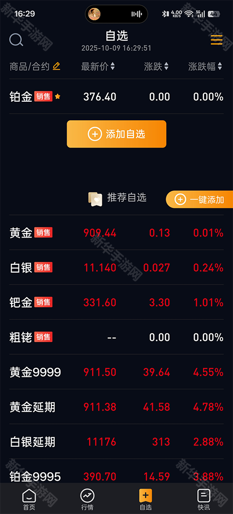 3、在行情页面点击“添加自选”,可自定义关注列表,实时查看特定贵金属的行情。