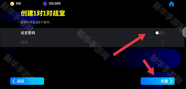 5、若是玩家创建对战室,就点击创建1对1对战室,然后设定密码后点击创建,当然你也可以选择不创建;
