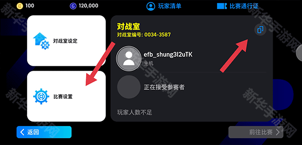 6、房间创建好后,将右上角的对战室编号告诉给好友加入,在等待好友加入时,你可以点击比赛设置;