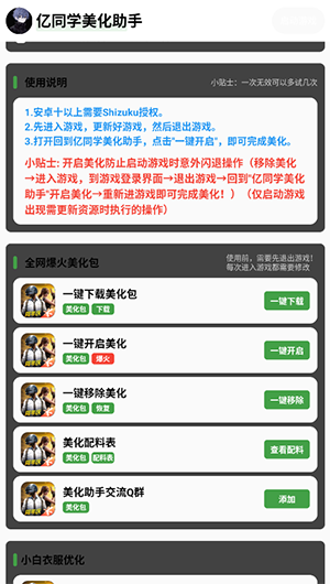 亿同学美化助手是一款专为手游用户们打造出来的美化辅助软件,有了这款软件之后就能更好的将游戏内容进行美化,获得更好的游戏画面、游戏界面以及丰富的游戏角色外观可供免费解锁,让你轻轻松松获得需要氪金才能获得的服饰以及皮肤。在这款软件内的各种功能不止免费而且无需root就能使用,操作起来也很方便十分直观,为每一位用户带来更好的辅助能力,感兴趣的用户就来本站下载吧。