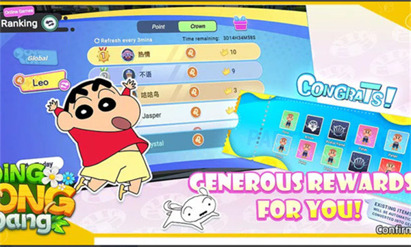 《蜡笔小新叮当当国际服》这是一款休闲竞技类型的游戏,游戏由“Brilliant Sense Technology Limited”工作室出品,这个版本为国际服,玩家将扮演蜡笔小新,和他的朋友们阿呆、妮妮、风间等朋友们一起在乡村的世界中快乐的冒险,游戏包括城市、村庄、海洋等各种场景。玩家可以自由探索不同的地区,搜索各种物品和道具。最多支持4名玩家一起体验,并与4名对手一起享受跑酷的乐趣。