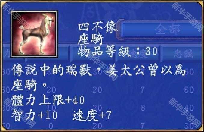 四不像在游戏中的属性:体力上限+40,智力+10,速度+7,忠诚+20。由于是加智力的,适合文官装备。