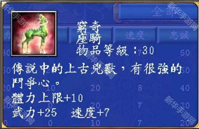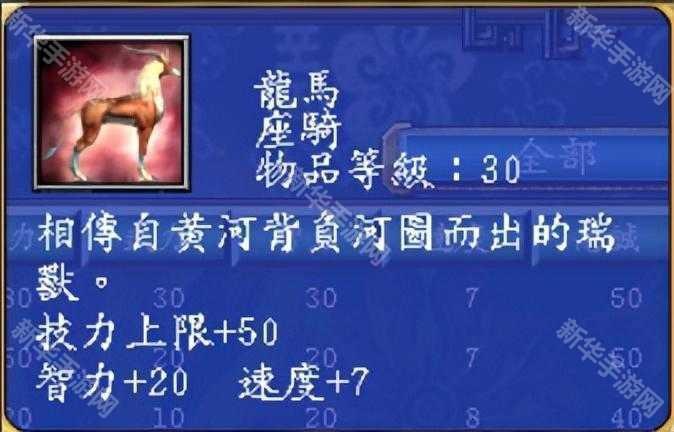 龙马在游戏中的属性:技力上限+50,智力+20,速度+7,忠诚+30。和四不像一样,都是加智力的,但属性上比四不像更好一点。