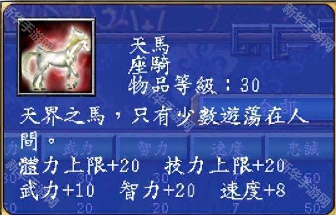 天马在游戏中的属性:体力上限+20,技力上限+20,武力+10,智力+20,速度+8,忠诚+40。偏向武将,更适合文武双全的将领装备,比如赵云姜维等。