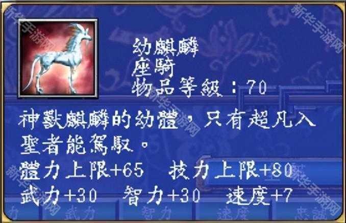 幼麒麟在游戏中的属性:体力上限+65,技力上限+80,武力+30,智力+30,速度+7。整个游戏玩家只能得到一头。