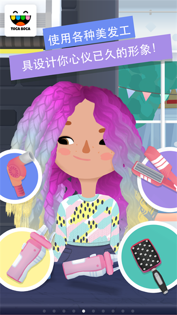 《托卡生活发廊3》这是一款模拟类型的游戏,这款游戏由“Toca Boca AB”工作室制作,是新的托卡美发沙龙系列,玩家可以用剪刀、染发膏、洗发水和烫发棒等不同的工具来为客人理发,还可以为屏幕中的角色化妆,打造美丽的妆容和独属于自己的时尚。玩家可以制作多层不同颜色的染发,更换角色的形象,换装等等,自由度非常高,如果玩家愿意,还可以分享你的时尚给社交软件上的好友。