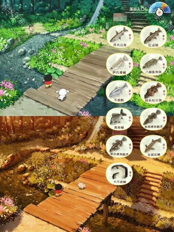 1.钓鱼、捕捉蝴蝶、采摘山菜、种植蔬菜,以及用小新风格的奇怪动作与NPC互动。