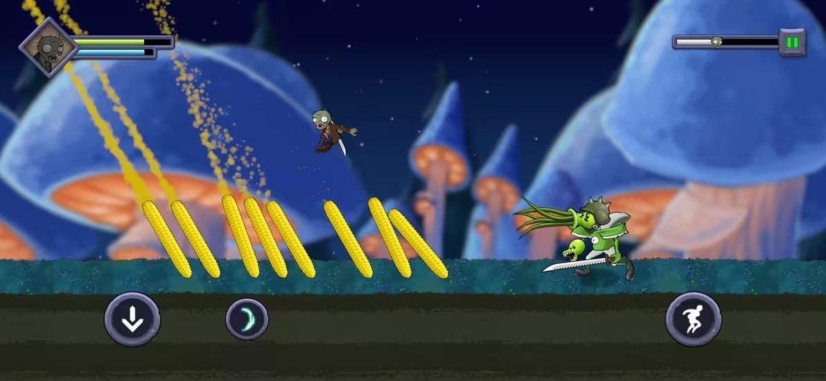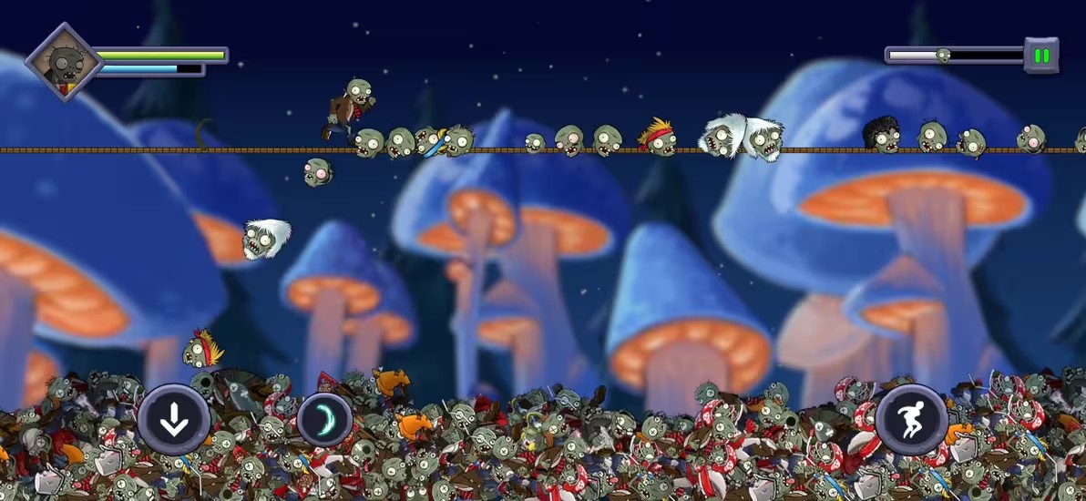 3、进入关卡后僵尸会自动前进,在屏幕左右的上下分别是跳跃和切换方向,有时向下的按键会变成冲刺。