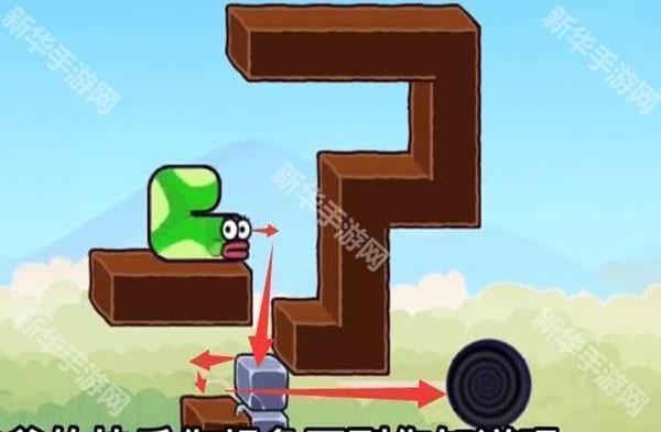 1、移动贪吃蛇,借助左侧的石头和苹果将右侧的石头推下去,然后吃掉苹果