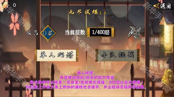 核心玩法:爬塔闯关,共400层,分单人爬塔和小队挑战。