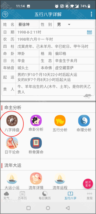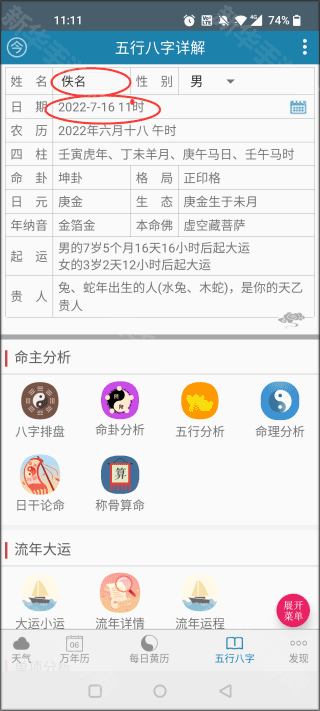 6、五行八字:专业八字算命,包括八字排盘、命卦分析、格局旺度、五行分析、大运小运、流年运程、八字论命、性格简评、健康状况、功名事业、感情婚姻、财运分析、祖业父母、兄弟姐妹、子女情况、重大关口、后天补救等十几个维度的详细分析。